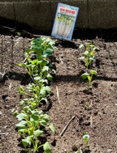 一生懸命咲いて、その横には秋冬を待っている野菜の苗。